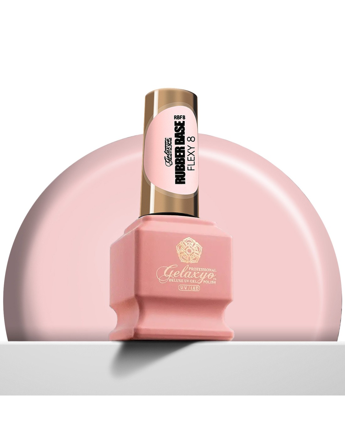 Gelaxyo Rubber Base Flexy 8 este o bază de o culoare nude plăcută, se poate utilizată ca bază pentru toate tipurile de materiale, oje semipermanentă, gel sau acrylgel. Asigură o aderență maximă la unghia naturală, garantând rezistența pe unghii până la 6 săptămâni.