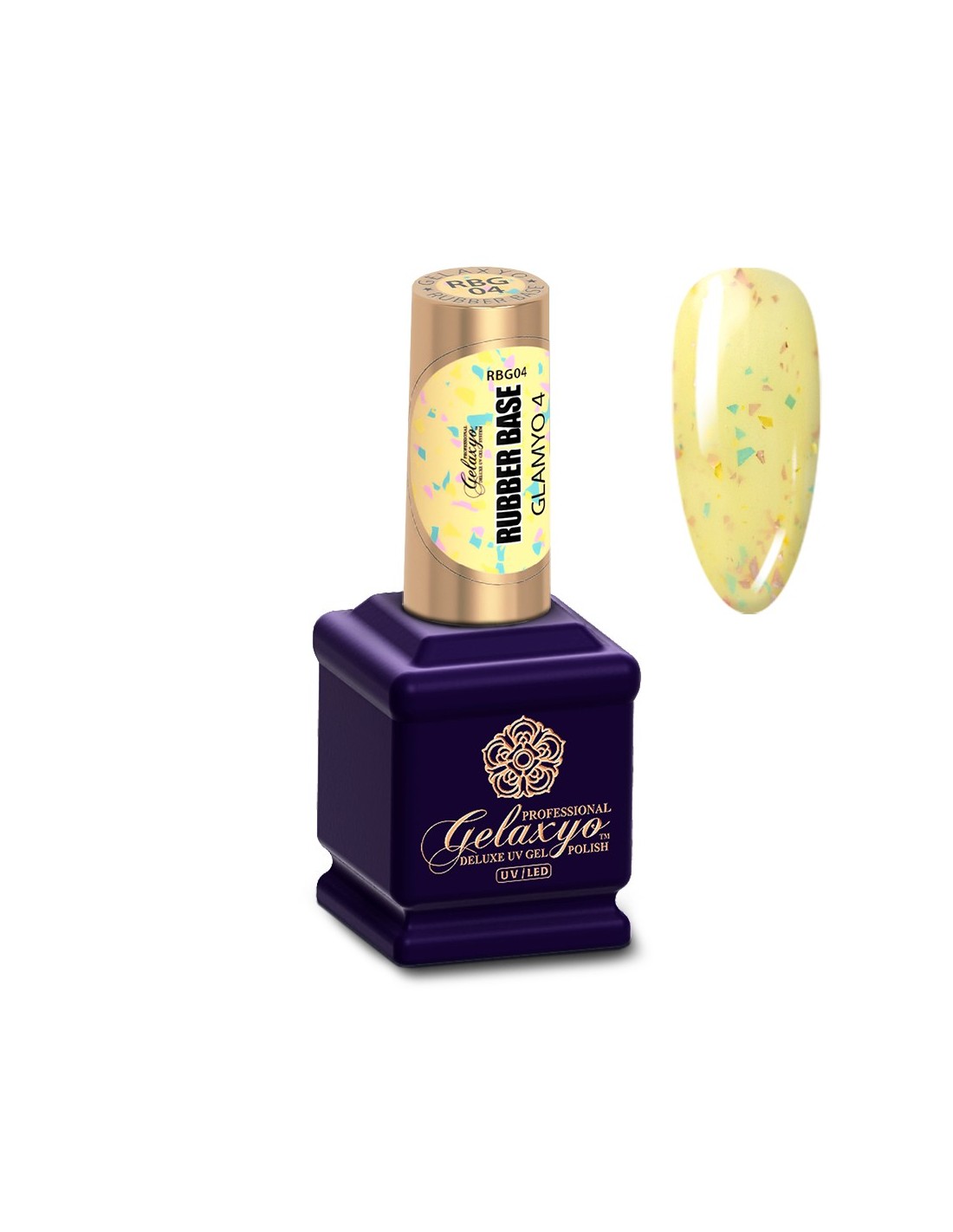 Gelaxyo Rubber Base Glamyo 4 este o bază de culoare galbenă cu fulgi aurii, turcoaz și roz pentru un aspect suav și delicat. Formula sa inovatoare nu necesită aplicarea unei alte baze în prealabil, precum și modelarea cu ușurință a apexului, simplificând modul de aplicare.